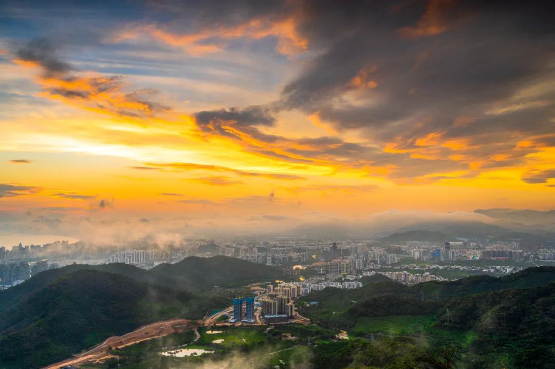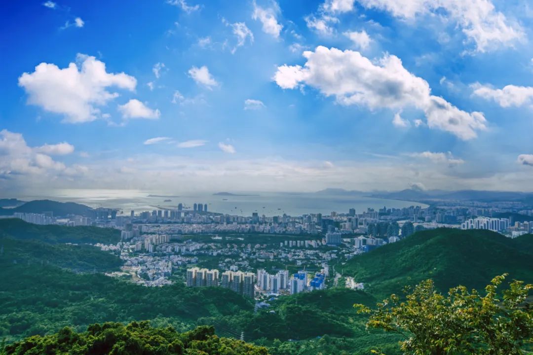 在观景台凭栏远眺,只见气象万千、美景壮阔:比比皆是的高楼大厦,波光潋滟的城中河流,四通八达的道路桥梁,绵延起伏的崇山峻岭,广阔无垠的碧海蓝天,无比壮观的“四湾一景”,美艳祥和的落日余晖……