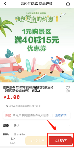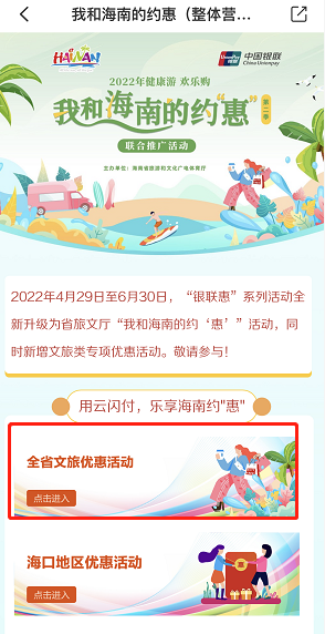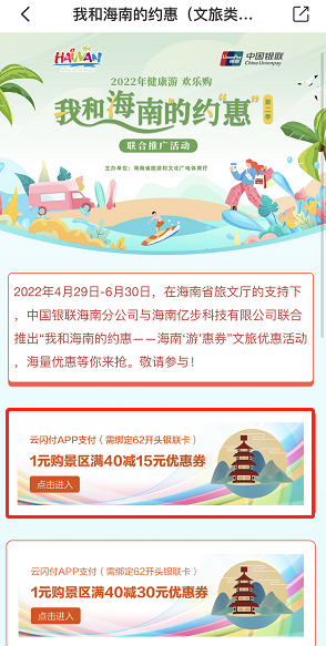 1、用户登录云闪付APP,进入本地专区“我和海南的约惠” 2、点击进入“全省文旅优惠活动” 3、点击进入“1元购景区满40元减15元优惠券”活动展示页面 4、点击“购买票券”跳转至商城可1元购优惠券1张,在参与活动景区购票使用云闪付APP支付可享优惠。 活动期间单用户单周限购1张,每月限购2张,票券有效期为6天。 抓住这波优惠, 来和小岭约会一“夏”叭! 此时的凤凰岭景色优美、 空气清新、森林茂盛, 勾勒出一幅生机盎然的自然画卷, 约上三两好友, 一起邂逅宫崎骏动漫里的夏天。 三亚之巅山海大观 白日纵览山海城, 夜晚赏万家灯火, 穿越奇幻森林,邂逅凤凰原乡, 感受一段唯美的爱情故事, 沉浸式体验光影与森林的奇幻梦境交织。 凤凰岭山海奇幻夜 白+黑游玩模式 尽享出游极致体验! 带上优惠, 来凤凰岭愉快玩耍吧!