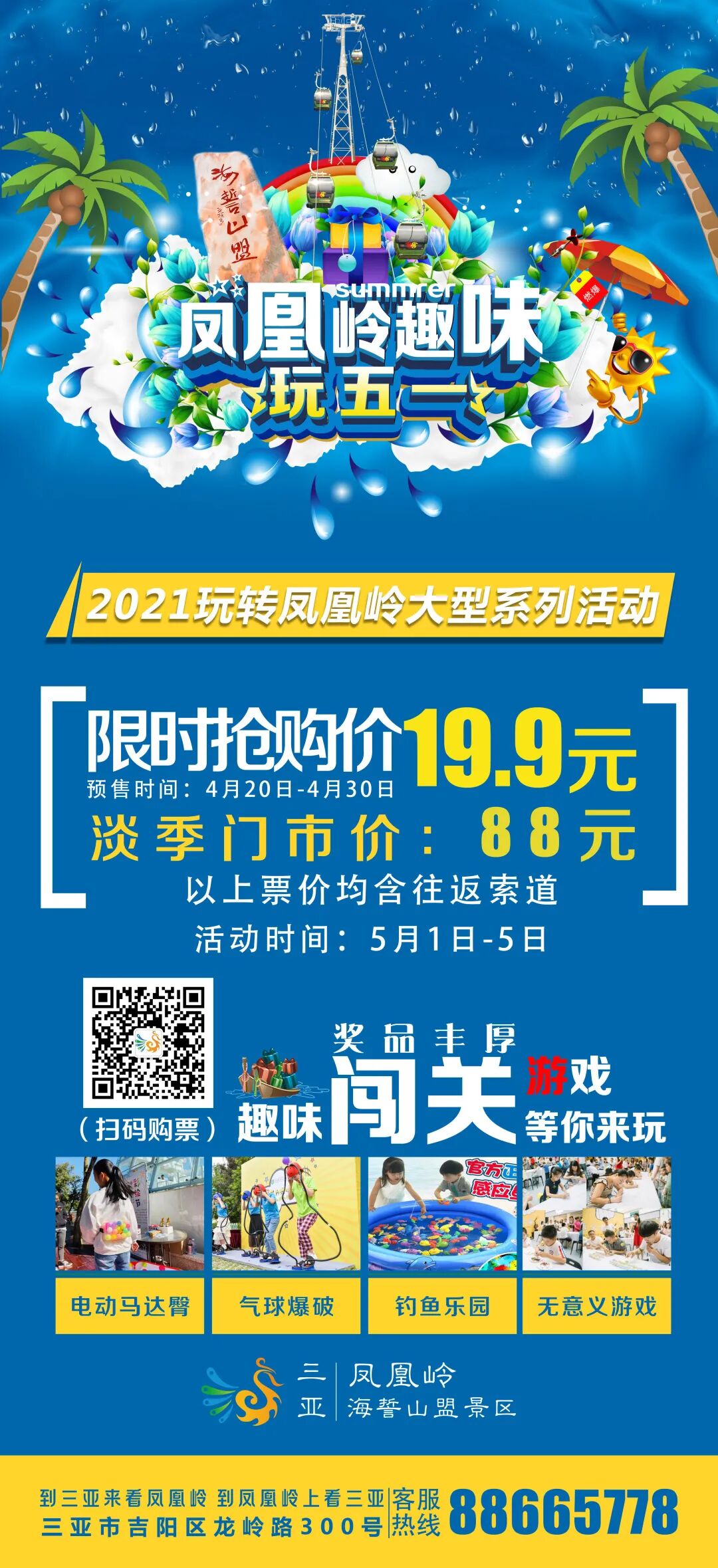 五一趁着大把的时光让笑语填满这个假期一定要关注收藏哦,抢购日期为4月20-30日!原价88元的门票+索道,限时抢购价为19.9元!往期活动集锦:精彩镜头SHOTS快乐无限!不仅要享受欢乐的浮生几日更要遍览山海城天的三亚凤凰岭归来不看景看景只在凤凰岭豪华的空中缆车尽揽全城美景阳光下的水晶圣殿如水晶般的爱情熠熠生辉五一畅玩大三亚 一起欢游凤凰岭!